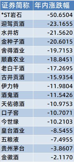 今年以来,白酒股全线下跌,迎驾贡酒、水井坊、金种子酒等跌超20%,“茅五泸”也全部走低。