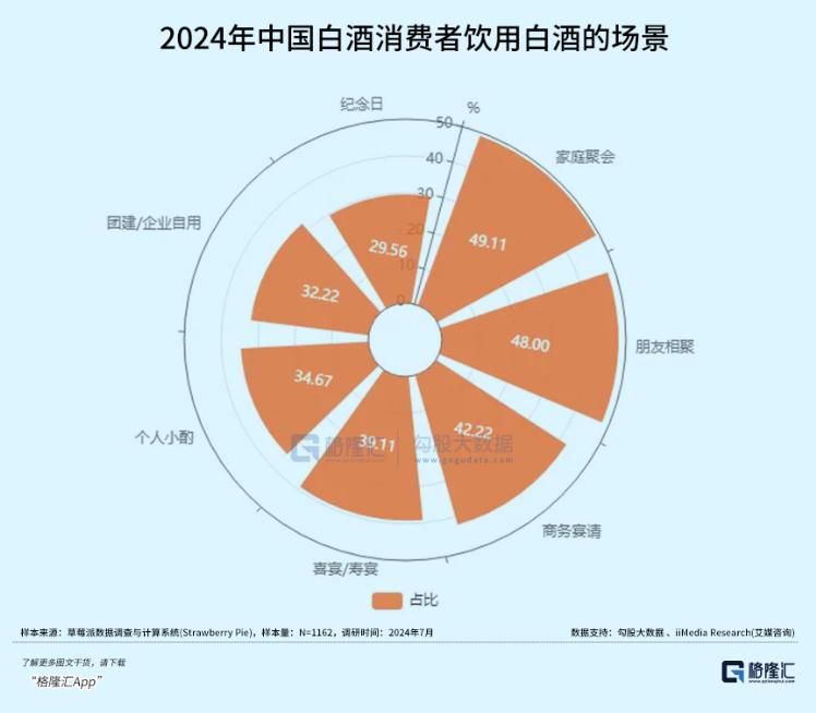 艾媒咨询数据显示,2024年,家庭聚会和朋友小聚,已经超过商务宴请,变成了白酒最为常见的消费场景。