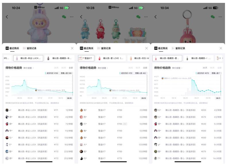 单看刚发布不久的“搪胶4.0 mini LABUBU”,在得物APP销量最高的“L”款,成交均价也基本下降了30%。