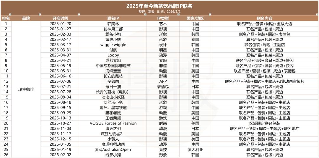 而2025年,瑞幸不再恋战价格战后,频频在联名上发力。据不完整统计,瑞幸在2025年的联名约30次,包括与封神、黄油小熊、LOOPY、刘亦菲、长安的荔枝、疯狂动物城、王者荣耀等多个IP联名。其中,与治愈系IP线条小狗推出联名产品及周边,杯套、贴纸、马克杯等周边上线即秒空。