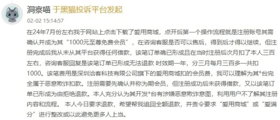 在小象优品App中,沣和小贷(由宏广信息100%持股)依然在为用户提供贷款服务。在黑猫投诉平台,以小象优品为关键词的投诉超过32000条,客户在不知情的情况下每月被扣取“会员费”是投诉的重灾区。