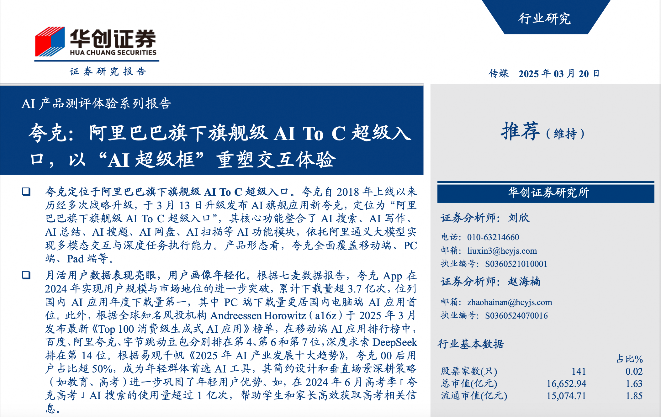 华创证券指出,夸克通过“All in One”设计理念与场景化深耕,成功将 AI 能力转化为普适性生产力工具。其年轻化用户基础、无广告体验及多模态创造力,不仅满足了当下效率需求,更为未来人机协作模式提供了全新范本。