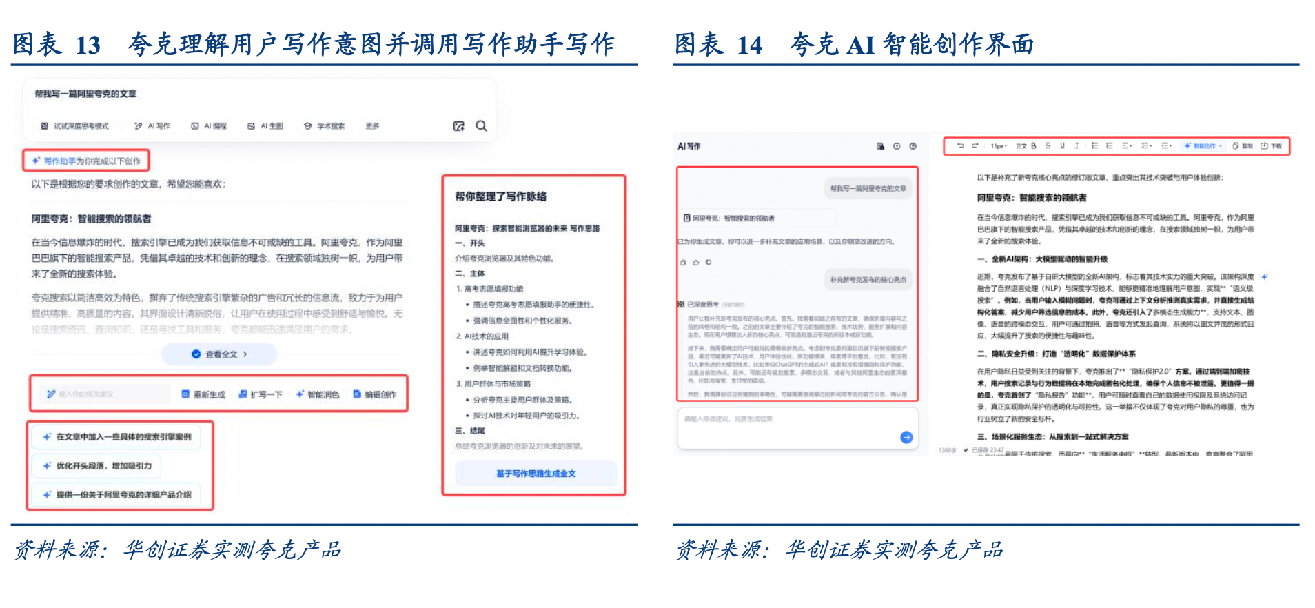 华创证券用夸克实测了日常工作、学习、生活的各类需求。以日常学习工作中常用的写作需求为例,华创证券输入写作需求后,夸克会自动识别用户的写作意图,调用“写作助手”Agent 完成文章初步创作,并在右侧整理了写作脉络,在下方允许用户进一步提出修改建议,还会给到一些修改建议。