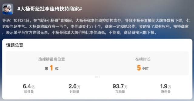 不过,美ONE和海氏的回应并未平息风波。24日当天,在“疯狂小杨哥”直播间,大杨哥爆料称李佳琦控价控库存,导致小杨哥直播间大牌多数被下架。大杨哥称库存有一百个,李佳琦卖七八十个,商家一定和他合作,卖的多了就有权利挟持商家。小杨哥称某大牌价格比李佳琦低,不能卖,商品链接只能下掉。25日,“大杨哥怒批李佳琦挟持商家”登上微博热搜第一,话题阅读量6.4亿。