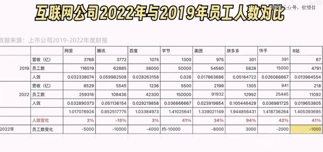 钛媒体App从互联网上看到了一则传闻的数据统计,2022年,在大厂普遍降低人员之下,阿里的人效增长2%,腾讯则降低15%,拼多多增长了94%。