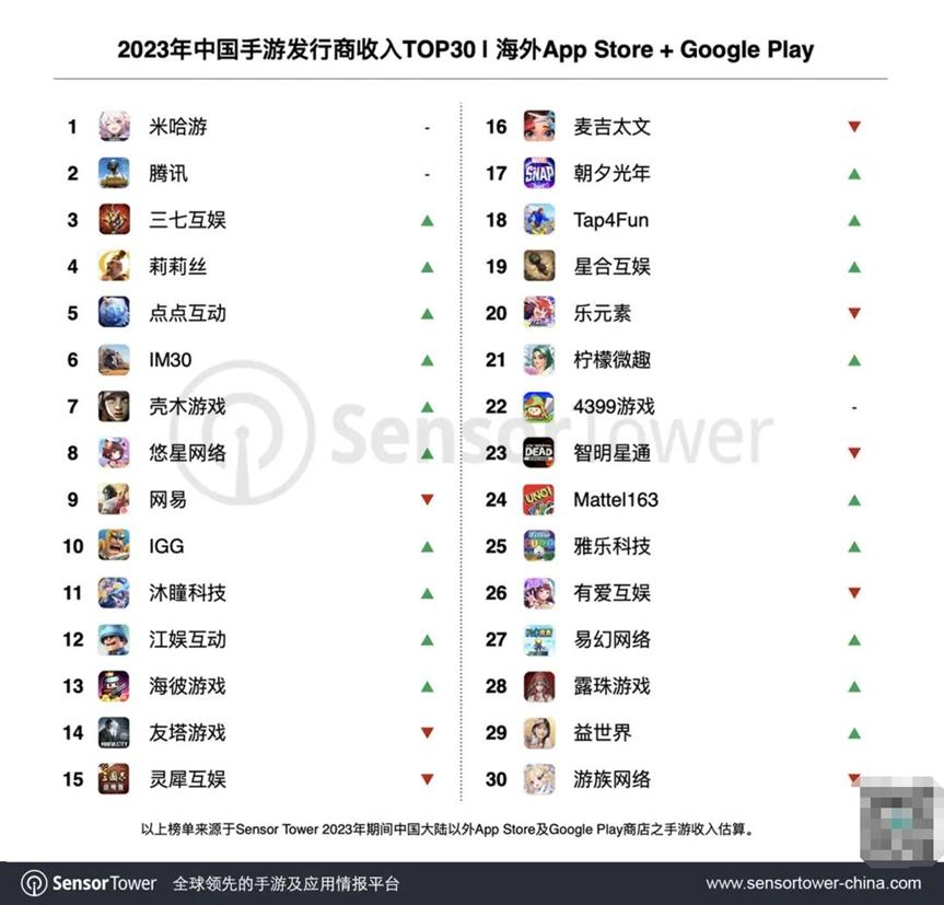 据Sensor Tower统计,盛趣游戏旗下点点互动2023年海外收入达到2022年的近3倍,成为2023年出海收入增长最高的手游发行商,排名上升13位,跃居收入榜第5名。