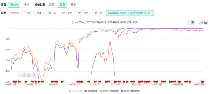 数据显示,《Last War》12月预估海外内购流水超8000万元,相较11月的2000万月流水增长超300%,并跻身韩国iOS畅销榜第7、韩国Google Play畅销榜第11,台服Google Play畅销榜第9,成为2024年第一款月流水过亿的国产出海SLG新品。