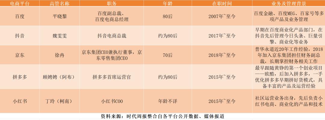 从抖音电商总裁魏雯雯、百度电商总经理平晓黎、到京东CEO(首席执行官)许冉、拼多多COO(首席运营官)顾娉娉,小红书COO柯南,电商半壁江山已成为女高管天下。