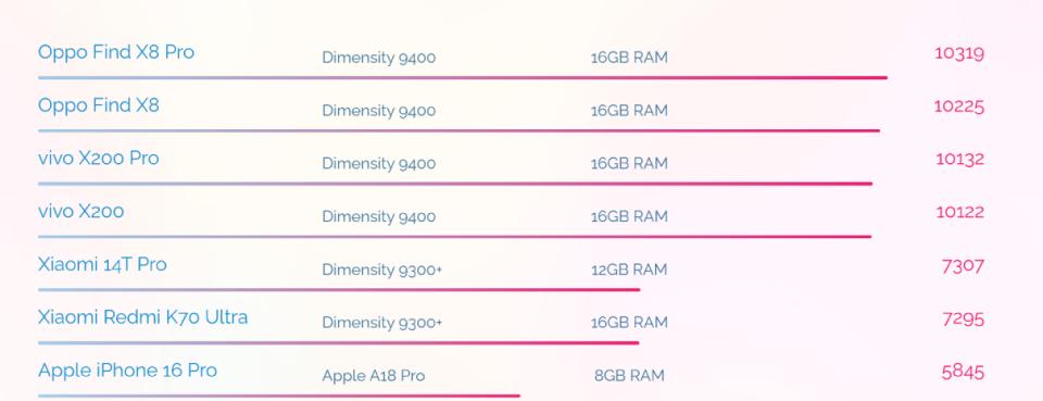 根据瑞士苏黎世联邦理工学院最新AI-benchmark排行榜,搭载联发科天玑9400芯片的智能手机AI得分在10122-10319之间,搭载苹果A18 Pro芯片的 iPhone 16 Pro AI得分为5845。