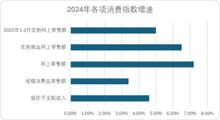 需要明确的一点是,主流舆论对消费增速并不乐观,但从数据层面看,电商大盘的增长趋势并没有改变:2024年城镇消费品零售总额依旧增长了3.4%,居民可支配收入增长了4.6%,网上零售额7.2%,其中实物商品网上零售额增长了6.5%。