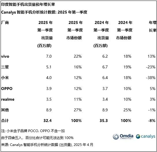 vivo(22%)靠中低端机型(如Y系列)和促销策略在印度市场拿到第一,OPPO(12%)和realme(11%)分列四、五名。