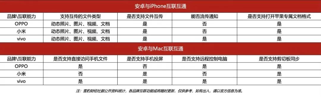 据雪豹财经社统计,目前OPPO、小米、vivo手机与iPhone、Mac的互联互通程度颇深,不光可查看苹果文件,还支持远程控制。