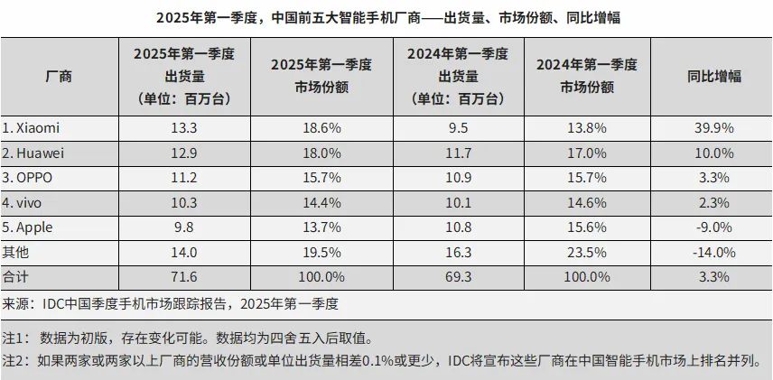 IDC数据显示,2024年Q1至2025年Q1,iPhone中国市场出货量分别同比下跌6.6%、3.1%、0.3%、9.6%和9%。