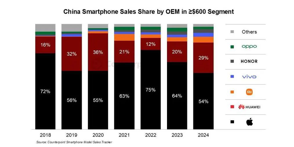 Counterpoint数据显示,2022-2024年,在中国售价600美元(约合人民币4356元)以上的高端智能手机市场,苹果市占率从75%降到54%,下降21个百分点;华为的市占率从12%增长至29%,增长17个百分点,此消彼长趋势明显。同期,OPPO、vivo、小米等品牌在高端手机市场的市占率没有明显增长。