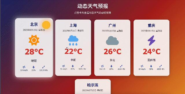 第一个prompt:生成一个天气预报卡片,选中单个卡片时有动态效果,如下雨、晴天等等。