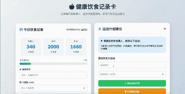 第二个prompt:设计一个饮食记录卡,记录每天的食品摄入,并标记相应的卡路里,以及建议的运动计划,可以设计一些扁平化的按钮。