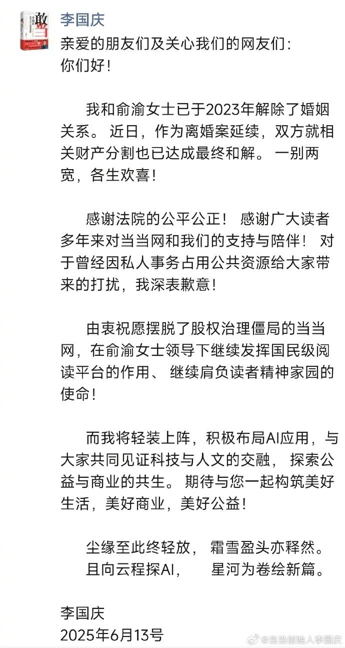 这份声明的核心内容,是李国庆、俞渝于2023年解除婚姻关系后,相关财产分割在日前最终达成和解。