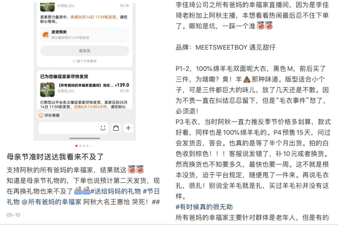 尽管才开播一个月,在小红书和微博等社交平台上,就已出现不少对“所有爸妈的幸福家”的吐槽。其中,其母亲节专场被网友吐槽称没有准时发货。有网友发布笔记称,“知道是母亲节礼物,下单也说预计第二天发货”但直到母亲节也未能发货。此外,还有网友提到自己在该直播购买的毛衣“拍的白色,收到棕色。客服说发错了……”并指出“所有爸妈的幸福家主要针对群体是老年人,但有的选品并没有很适合他们。”