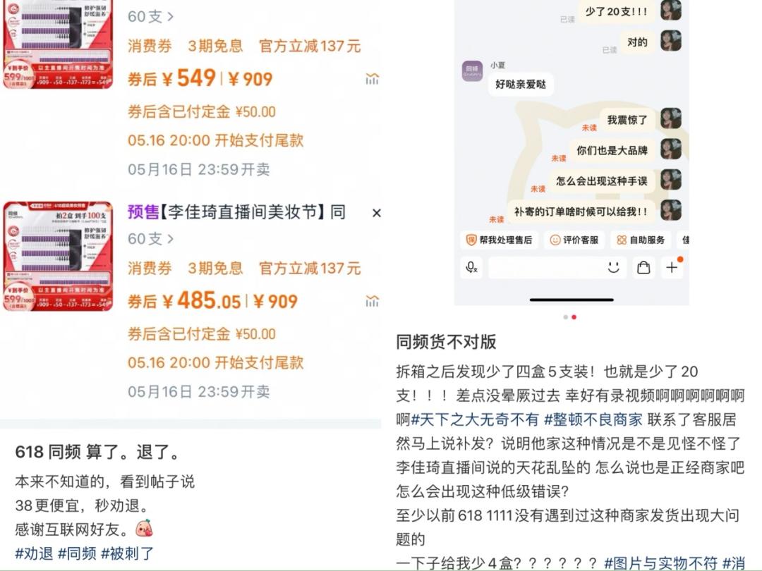 此外,还有消费者提到,自己在李佳琦直播间下单的同频产品“货不对版”,“拆箱之后发现少了四盒五支装,也就是少了20支……李佳琦直播间说得天花乱坠的,怎么会出现这种低级错误?”