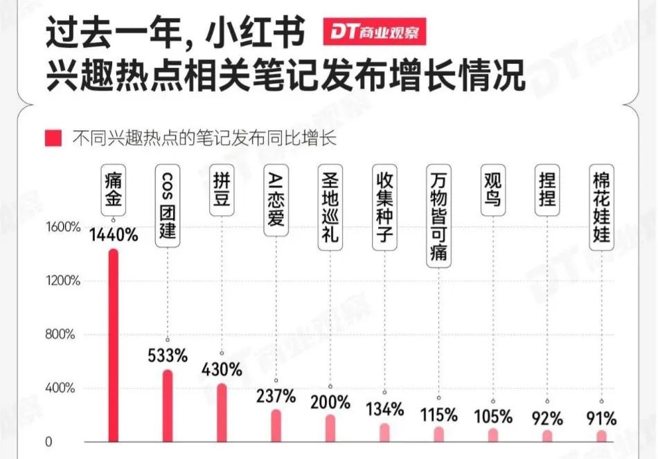 数据也揭示了小红书发力二次元的内在逻辑:过去一年,平台上二次元和游戏内容发布量分别同比增长175%和168%,成为增速最快的两大内容赛道,整体规模已仅次于时尚、美食这两大泛生活类内容之后。尤其值得注意的是,在热点笔记中,关键词“痛金”相关内容同比激增1440%,远超排名第二的“cos团建”。