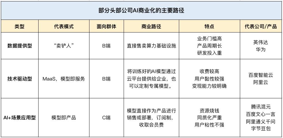 头部企业基于自身资源和业务基础,选择了不同的AI商业化路径,目前大致可以分为几类模式,部分交叉并存。