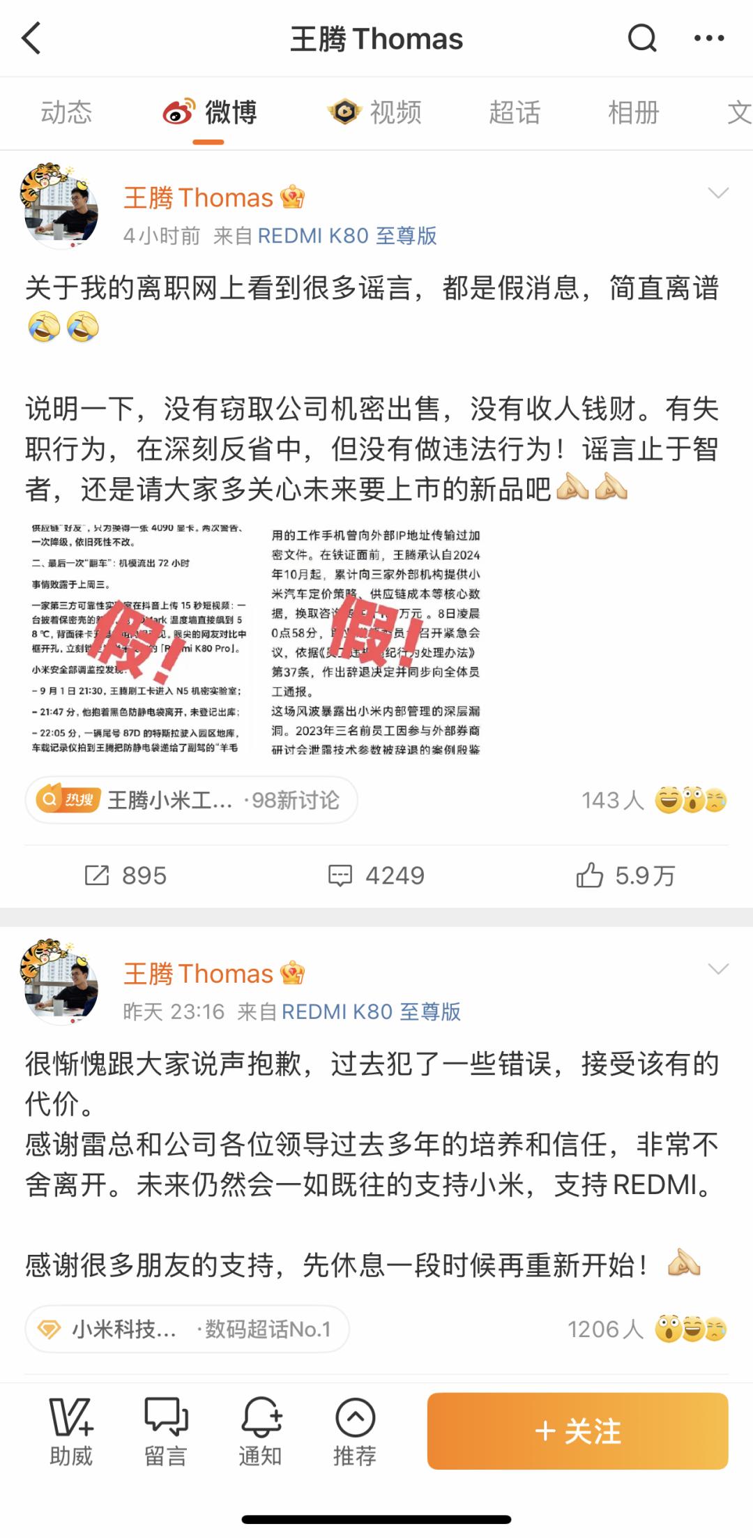 9月8日深夜,王腾在微博回应:“很惭愧跟大家说声抱歉,过去犯了一些错误,接受该有的代价。感谢雷总和公司各位领导过去多年的培养和信任,非常不舍离开。未来仍然会一如既往的支持小米,支持REDMI。先休息一段时间再重新开始!”