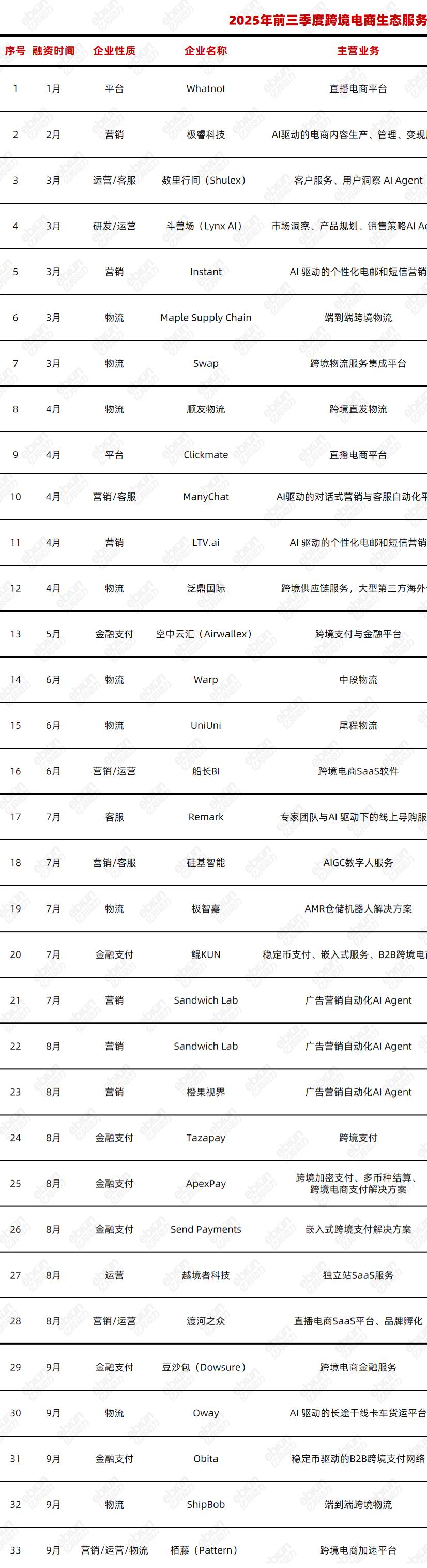 据亿邦动力不完全统计,2025年前三季度,包括各类细分服务类型(平台、建站、营销、运营、物流、金融支付、客服)在内,跨境电商生态服务领域共发生至少33起投融资活动,涉及32家出海企业以及两次IPO事件。