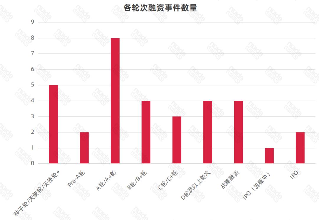 具体而言,种子轮/天使轮/“天使轮+”共计5起,Pre-A轮/A轮/A+轮共计10起,B轮/B+轮共计4起,C轮/C+轮共计3起,其他更高轮次的融资共计4起,战略融资共计4起,处于IPO流程中的项目共计1起,IPO成功上市融资共计2起。其中,成长期企业(Pre-A轮、A轮、B轮和C轮)的融资事件占比超50%。
