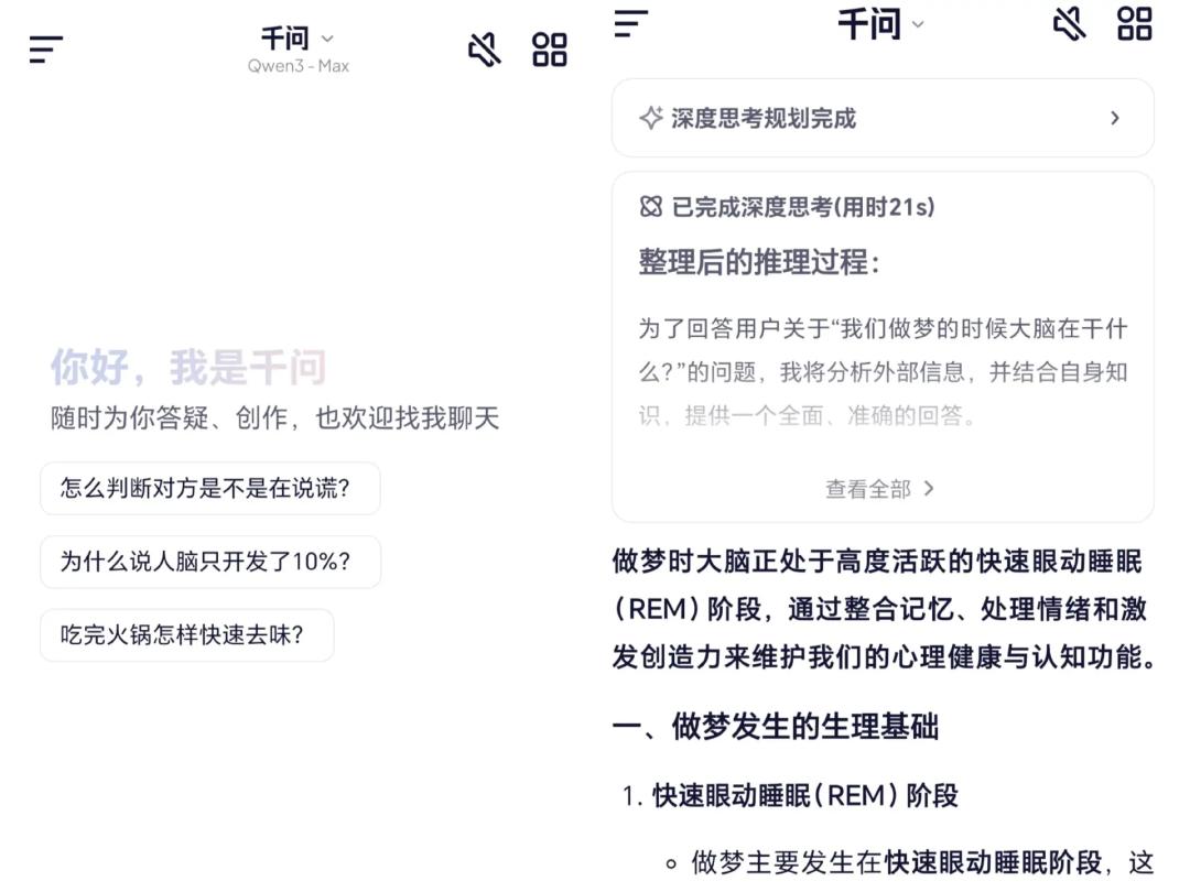 比如用户可在页面顶部切换模型(Qwen3-千问和Qwen3-Max双模型),前者负责回答有关生活中的常见问题,后者主攻推理、代码生成等更为复杂的任务;中部是对话结果展示区,显示聊天回复和生成内容;底部则为功能导航栏和问题输入区,包含、文字、语音、拍照和多功能入口。