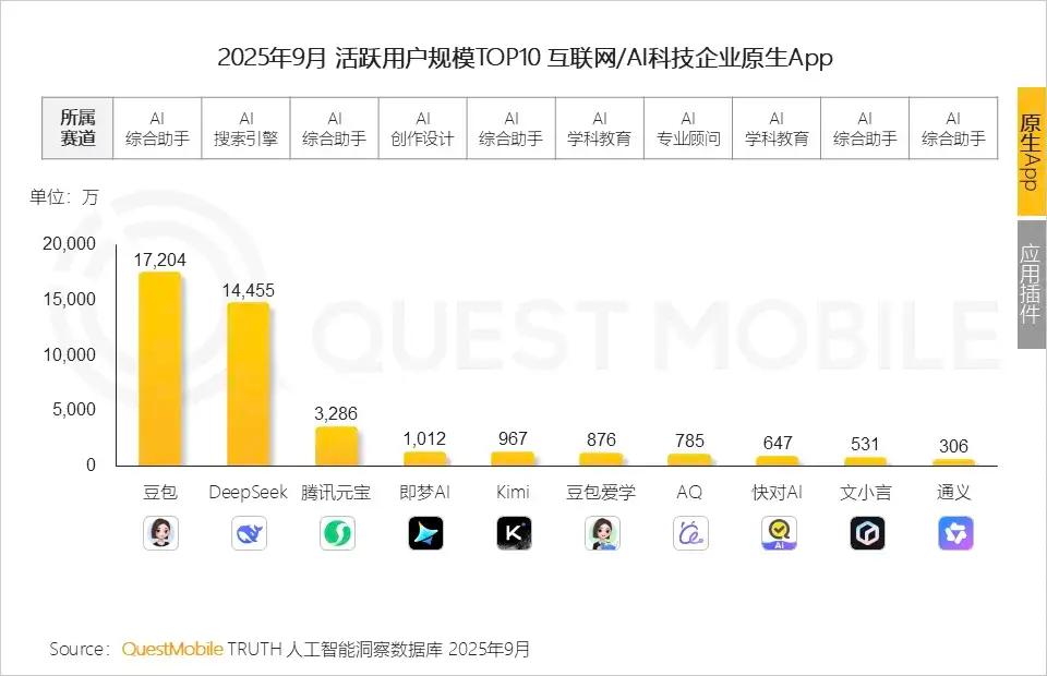 千问于11月才推出,暂无最新数据,我们可以从更早的公开数据观察其前身的用户基础。QuestMobile数据显示,豆包和DeepSeek的9月月活(MAU)过亿,反观通义(现千问)仅有306万左右。