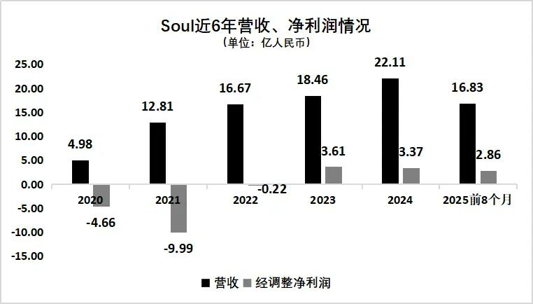 先看收入。Soul总营收从2020年的4.98亿增长至2024年的22.11亿,2025年前8个月营收更是达到16.83亿,较上年同期的14.28亿增长17.86%。