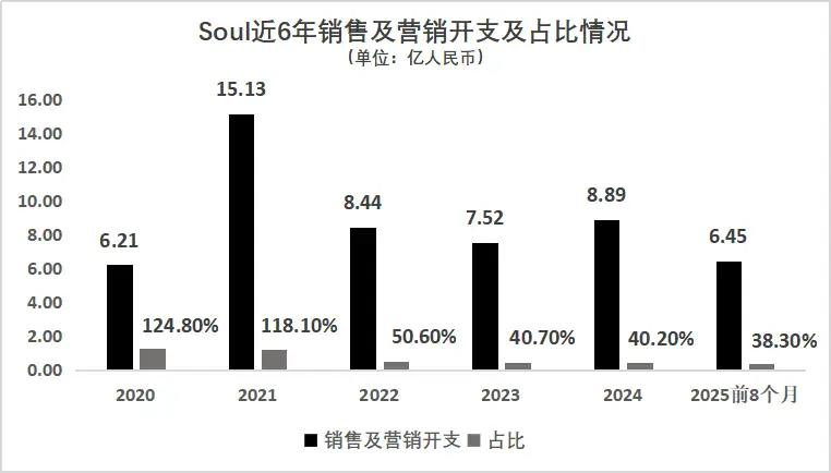 招股书显示,Soul的毛利率长期稳定在80%左右,2025年前8个月为81.5%,看似是一门好生意。但高毛利率并不自动带来高利润,值得注意的是,Soul也在收缩销售及营销开支,从2020年占总收入的124.8%回落至2025年前8个月的38.3%,成本结构更加健康。