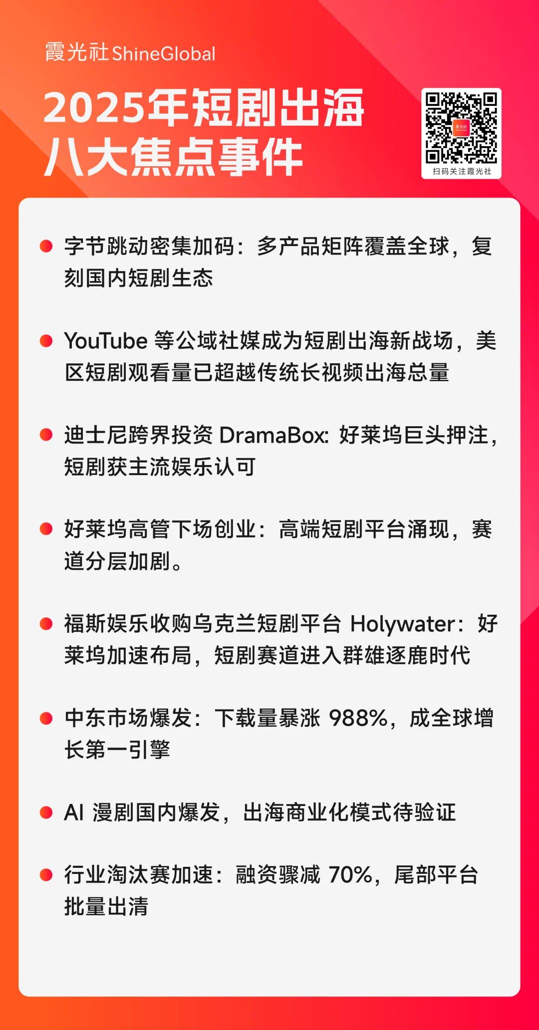 如今,中国短剧以技术迭代、载体焕新、话题创新,精准捕捉全球观众的情感共鸣,打造出独树一帜的叙事节奏与呈现方式。短剧出海的故事还能走多远?霞光社将持续关注中国短剧在海外的最新动态。