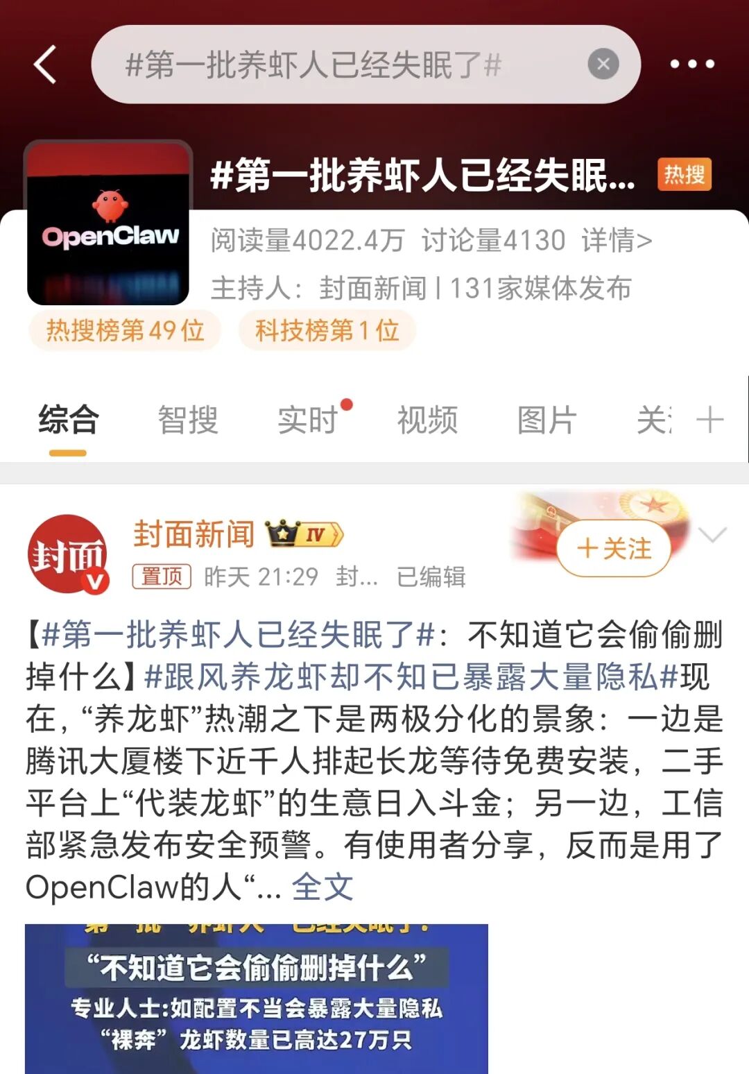 恰在今天,微博热搜上出现了这样一个话题——“第一批养龙虾的人已经失眠了”,说的其实就是上面这两点(当然着重还是强调安全问题)。