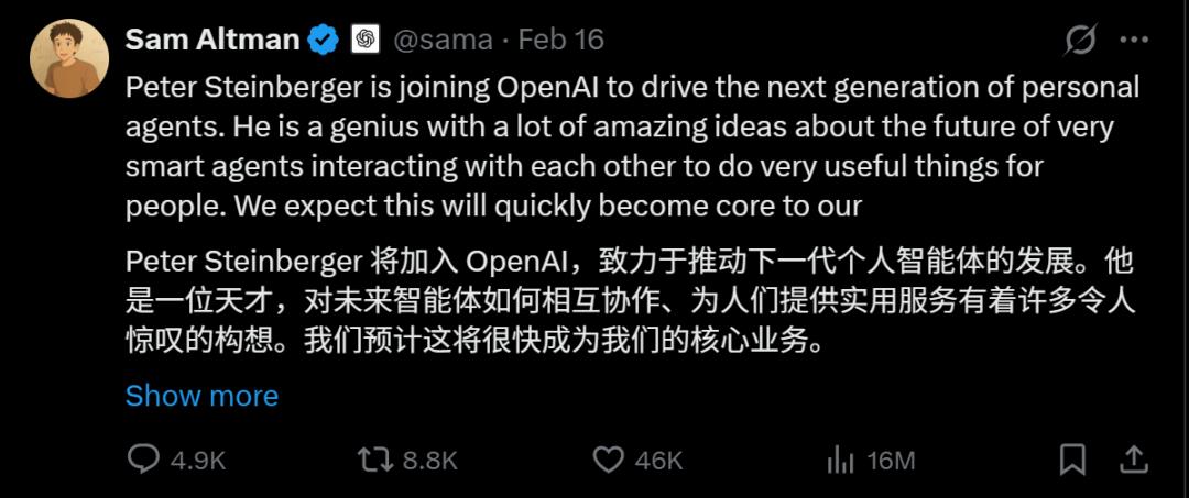 龙虾火,那就火速挖来龙虾之父Peter Steinberger,而且CEO奥特曼顺势宣布大力进军智能体协作领域。