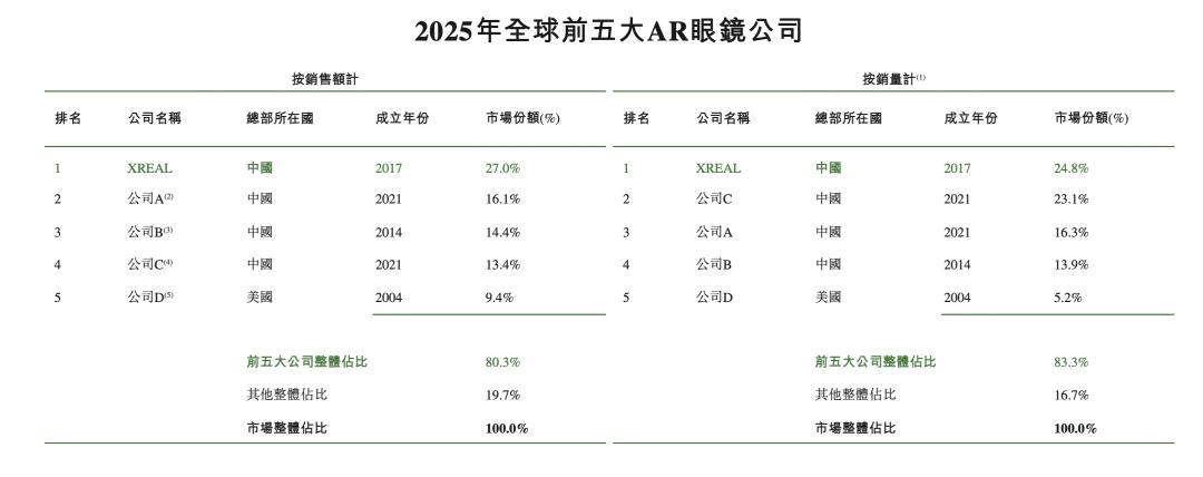 无论按收入还是销量算,它都是全球AR眼镜行业的绝对第一。2025年按收入计算,市场份额达到27.0%。