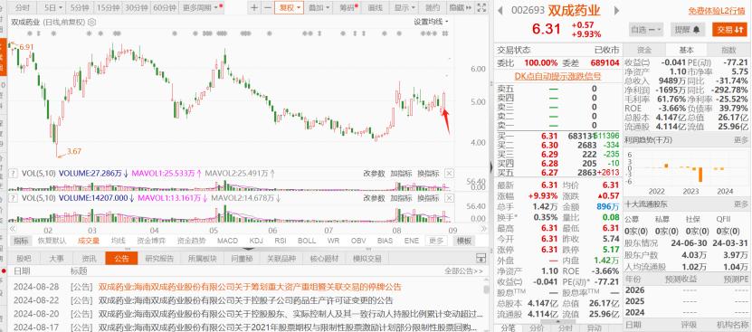 值得注意的是,双成药业于8月28日发布关于筹划重大资产重组暨关联交易的停牌公告,而停牌的前一天股价大涨9.21%;9月11日复牌后,录得连续两个涨停。