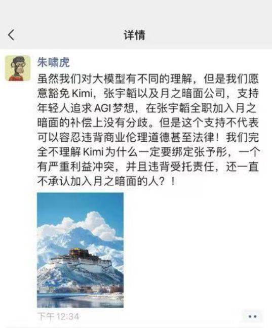 此前,朱啸虎曾发朋友圈表示,“虽然我们对大模型有不同的理解,但是我们愿意豁免kimi、张宇韬以及月之暗面公司,支持年轻人追求AGI梦想,在张宇韬全职加入月之暗面的补偿上没有分歧。但这个支持不代表可以容忍商业伦理道德甚至法律!我们完全不理解kimi为什么一定要绑定张予彤,一个有严重利益冲突,并且违背受托责任,还一直不承认加入月之暗面的人。”