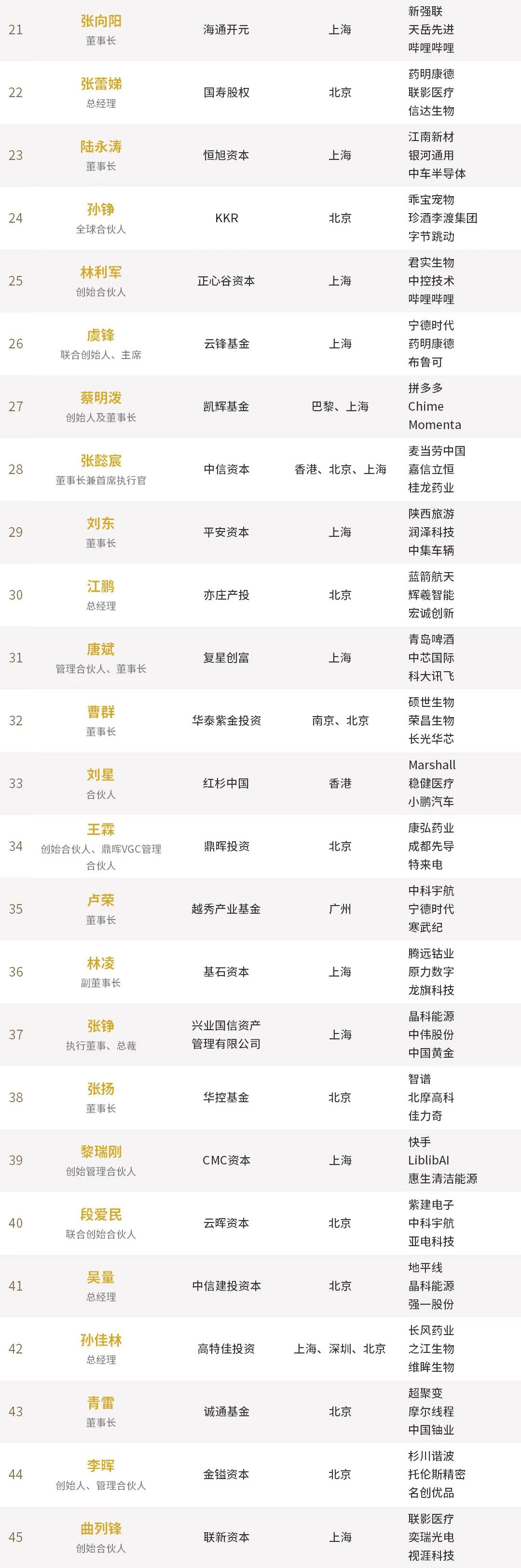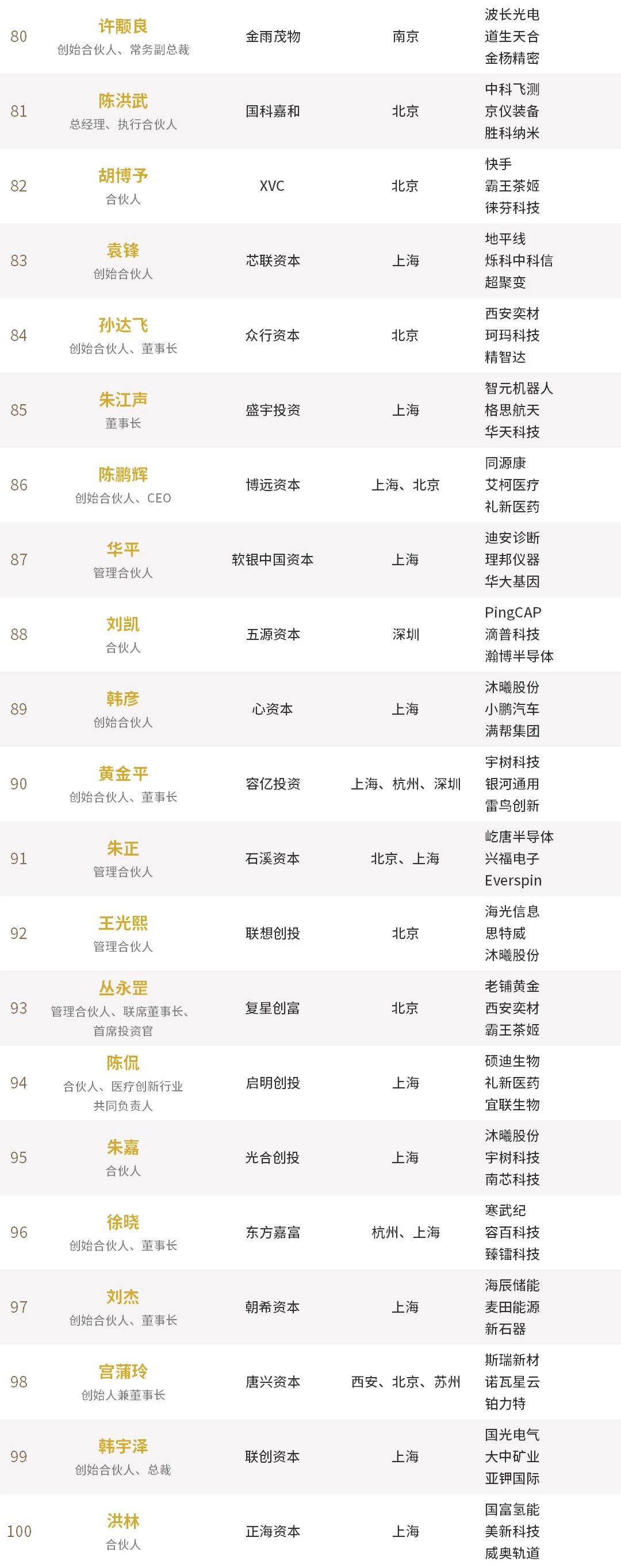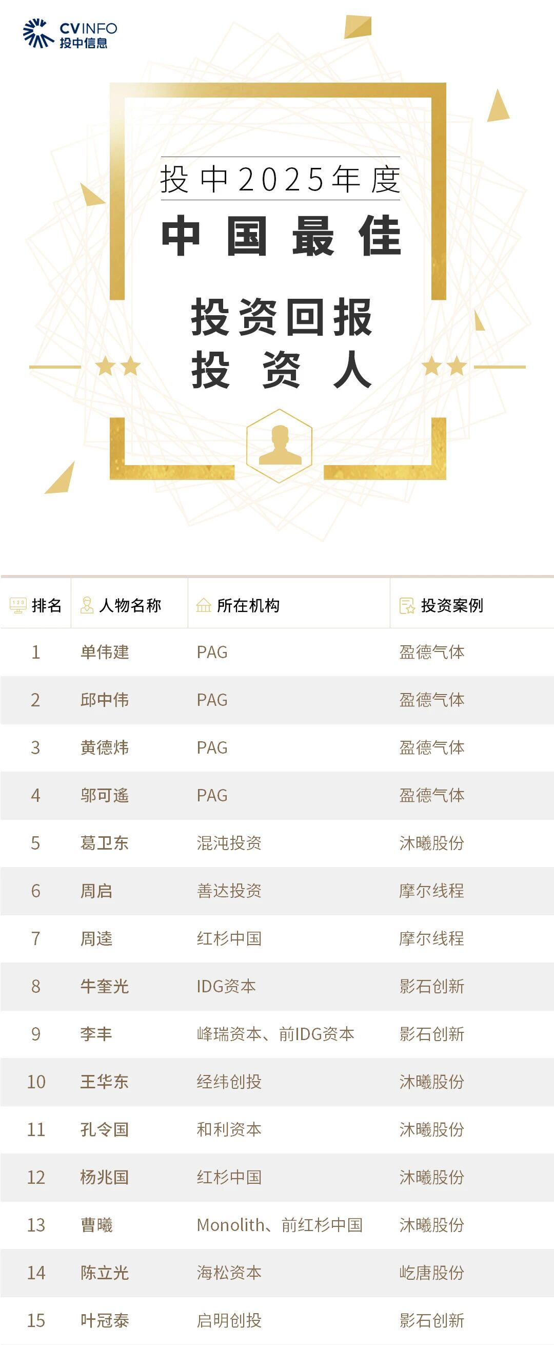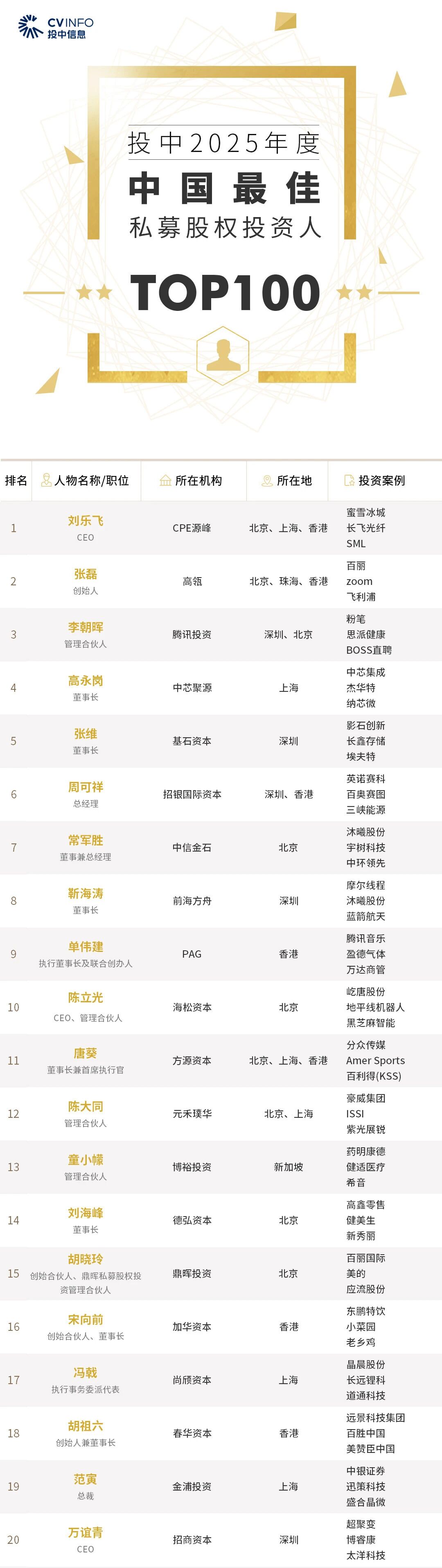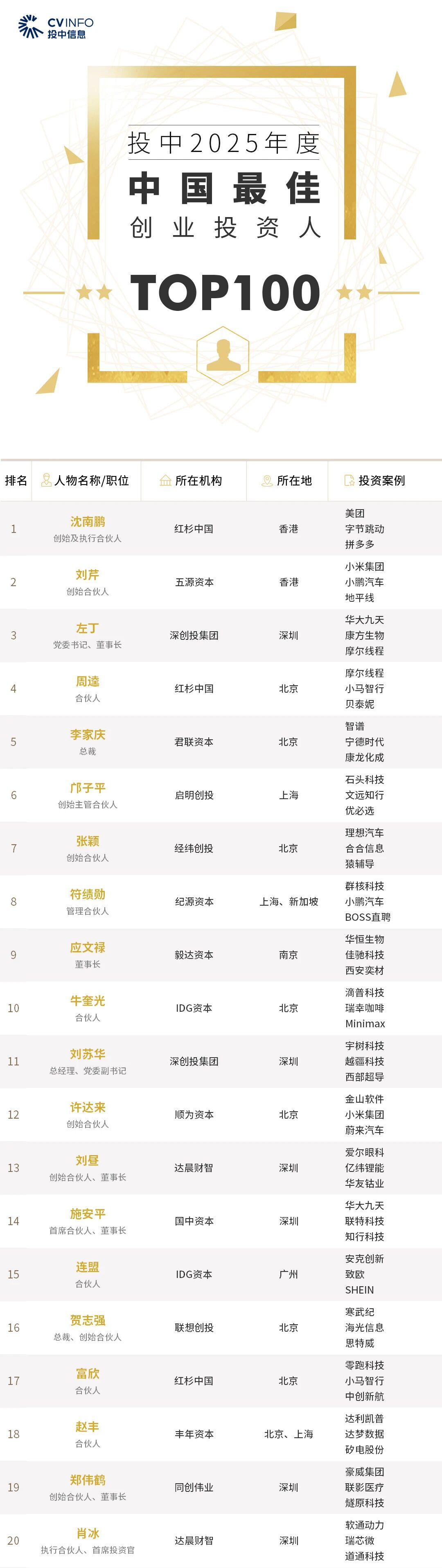 投中2025年度中国创业投资暨私募股权投资行业最佳投资人TOP100