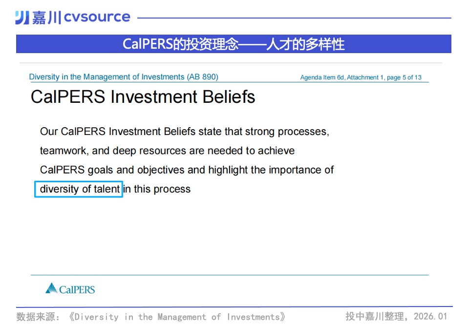 CalPERS在报告中重申了其核心投资信念:实现长期目标需要强有力的流程和深厚的资源,而“人才的多样性”是其中的关键变量。