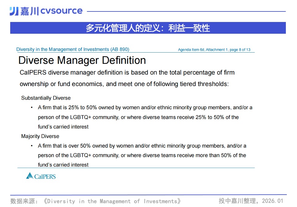 CalPERS直接穿透到股权结构和Carried分配比例。其标准分为“实质性多元”和“多数多元”。核心判断逻辑是特定群体是否拥有25%至50%,及50%以上的公司股权或Carried分配比例。