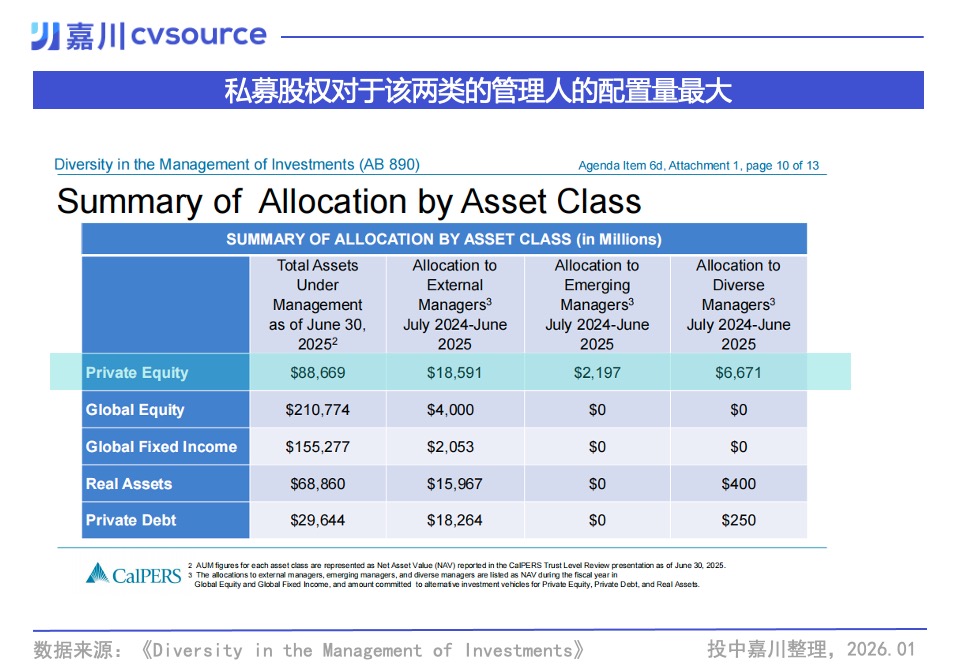 在私募股权这一类别中,2024年-2025年对新兴和多元管理人的合计配置近89亿美元,占私募股权投资年度外部配置总额的近一半,这种倾斜力度是惊人的。