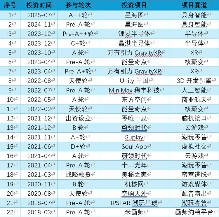 比如,具身智能公司星海图,2024年到2025年米哈游连续2次注资;2021年6月成立的国内第一家可控核聚变公司能量奇点,天使轮和Pre-A轮融资背后都有米哈游的影子;2022年,米哈游还参投了民营火箭公司东方空间的A轮融资;2021年,米哈游与上海交大的吕宝粮教授联合创立零唯一思,主攻脑机接口和情感智能技术。