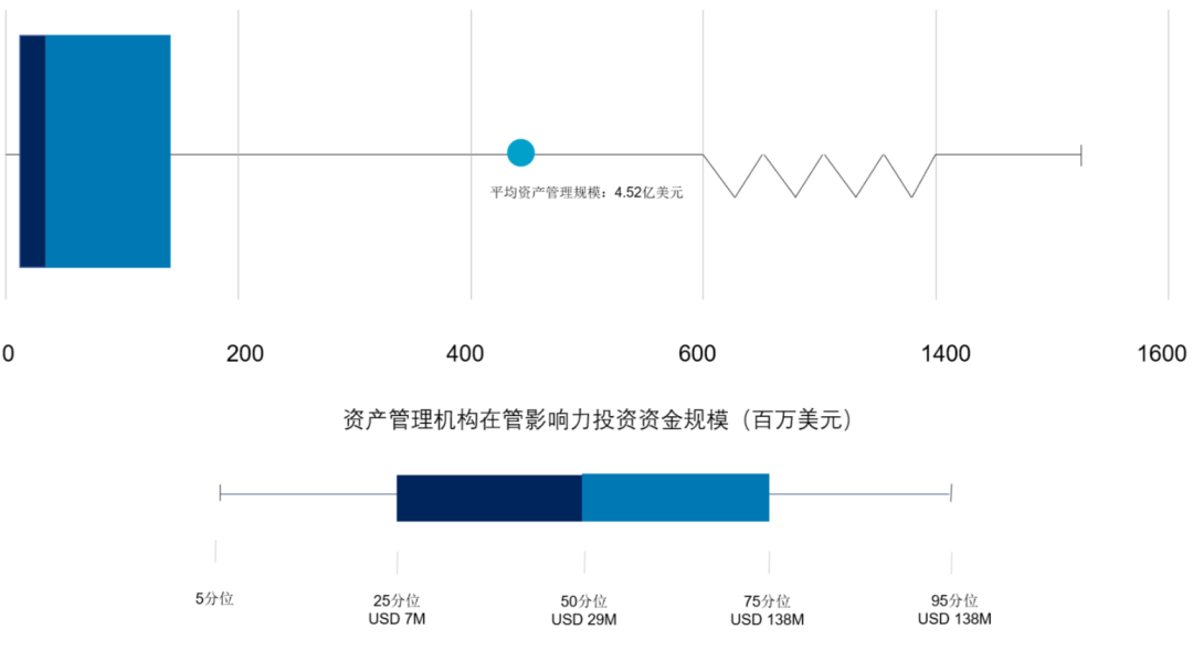 根据全球影响力投资网络(GIIN)研究数据显示,截至2018年底,全球1340家影响力投资机构在管资产达5020亿美元,在管资产规模中位数为0.29亿美元,平均资产管理规模为4.52亿美元,换句话说,近50%的资产管理机构在管规模均小于0.29亿美元,但也不乏许多大机构管理资产金额高于10亿美元。