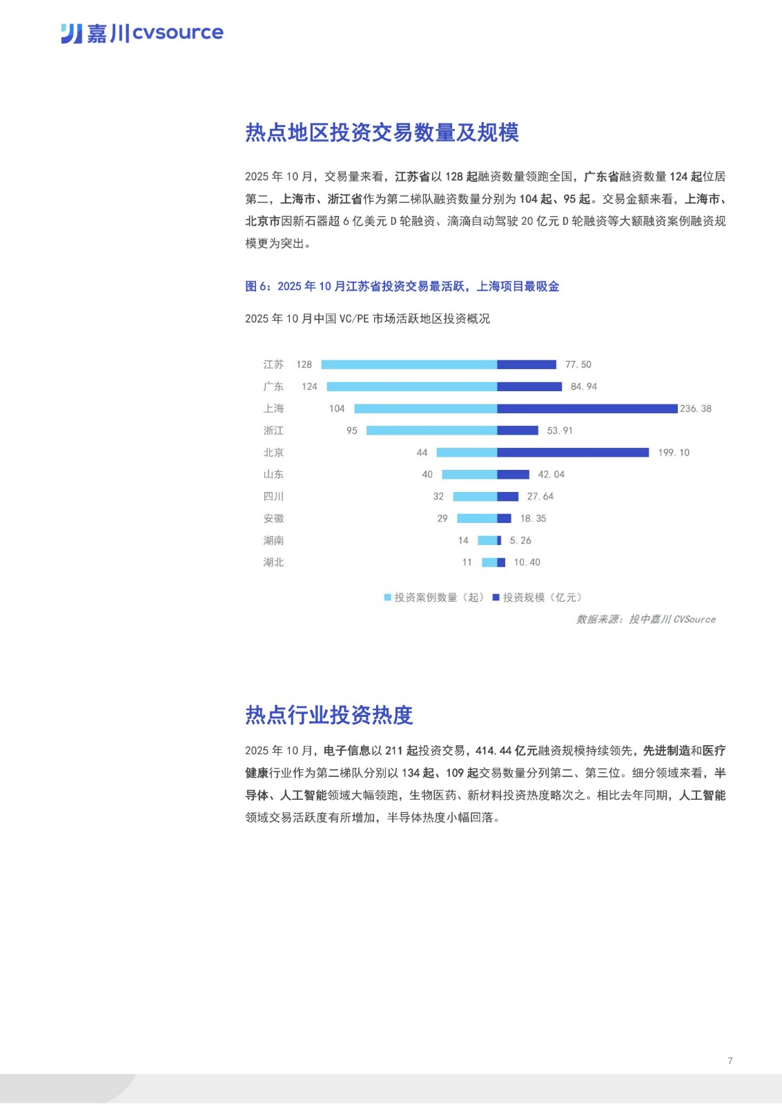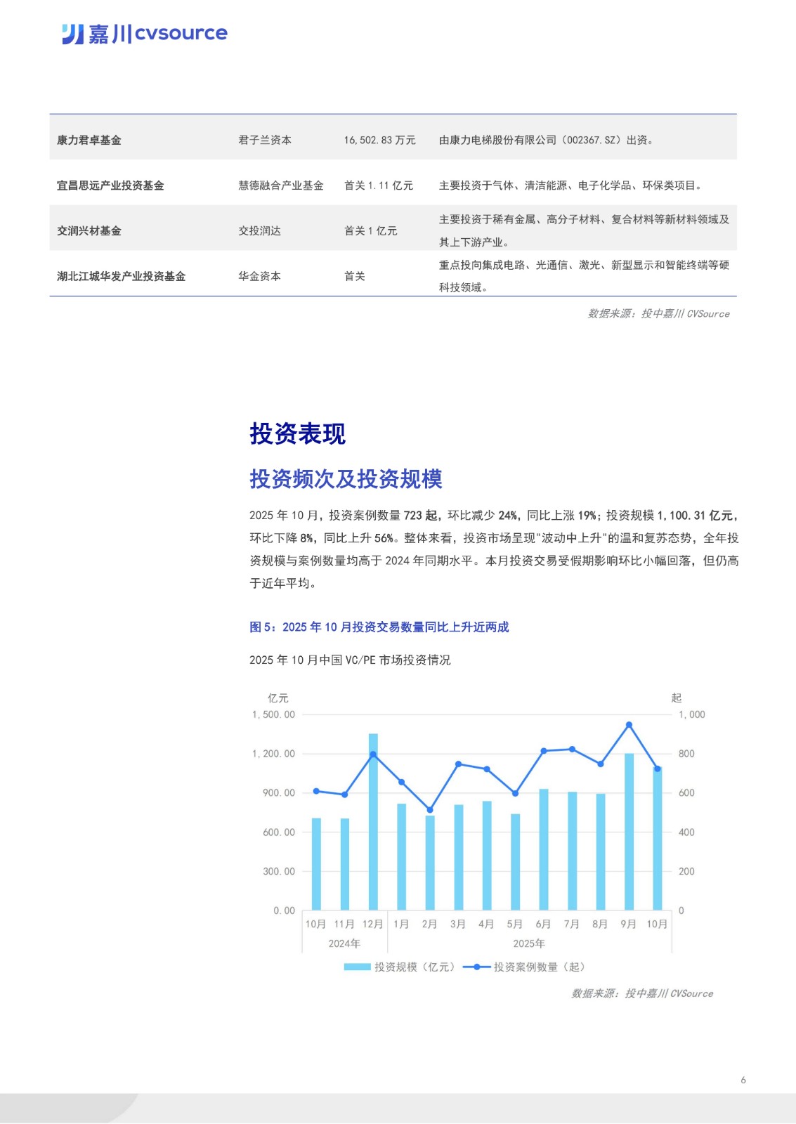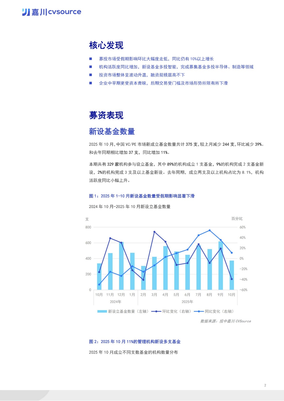 2025年10月, 募投市场受假期所限环比大幅度走低,同比增幅放缓但仍有10%以上增长,科技、先进制造领域更受机构关注。募资市场,机构活跃度同比增加,新设基金多投智能,完成募集基金多投半导体、制造等领域。投资市场整体呈波动升温,融资规模居高不下;企业中早期更受资本青睐,后期交易受门槛及市场形势所限有所下滑。