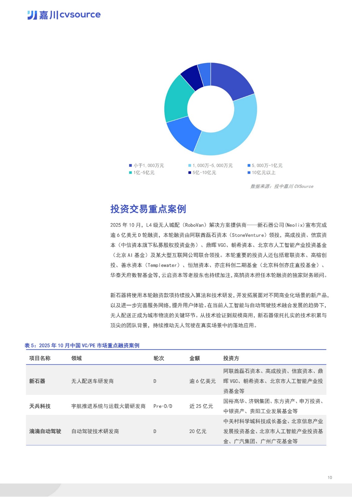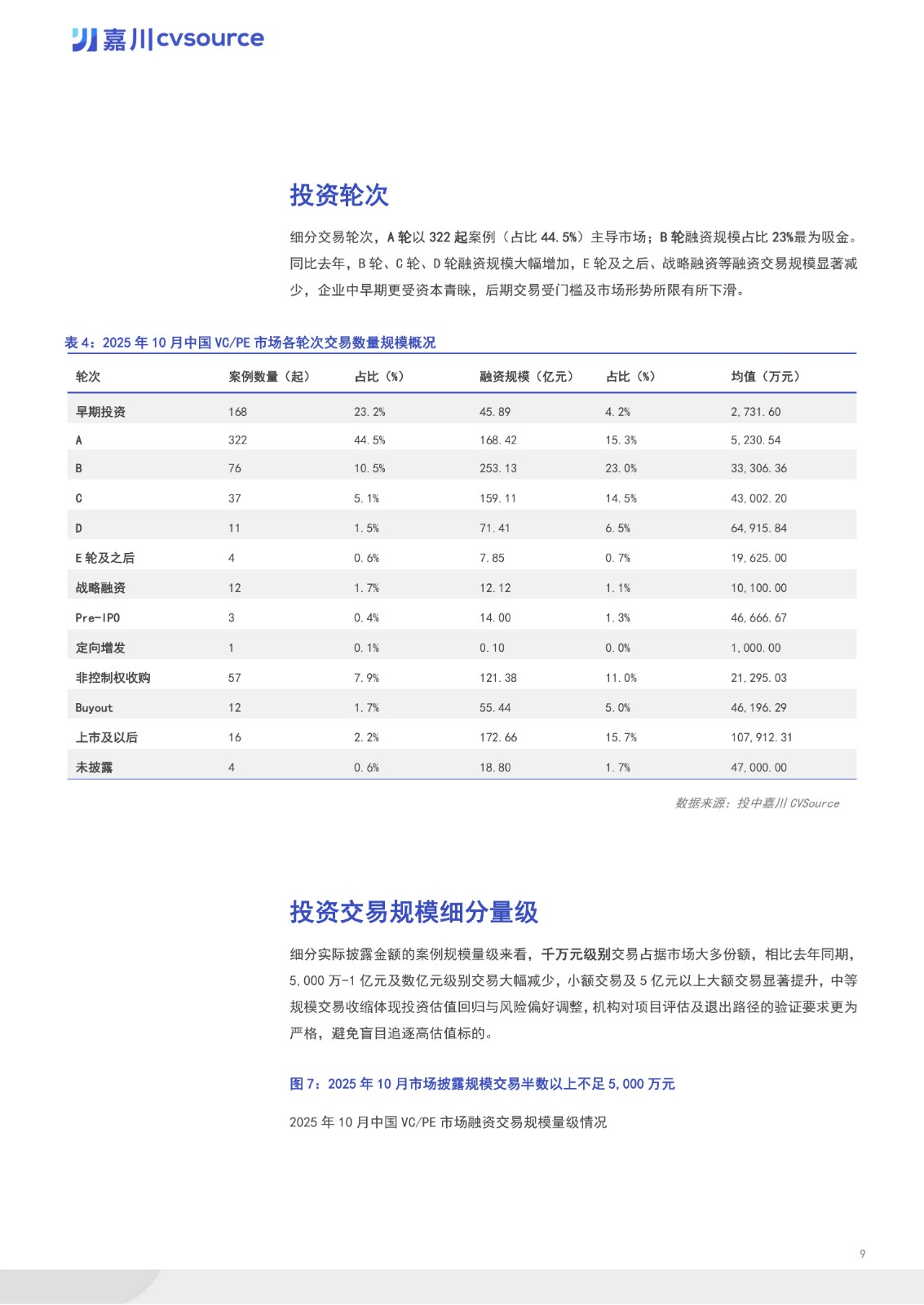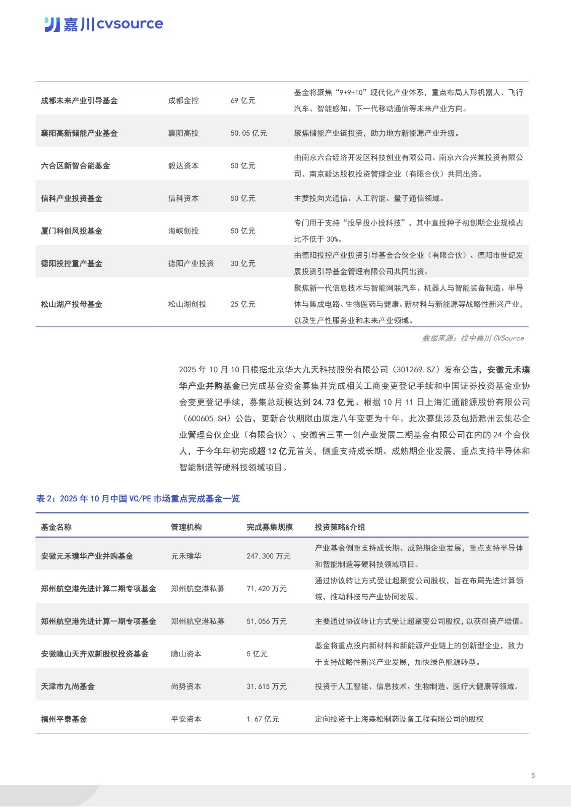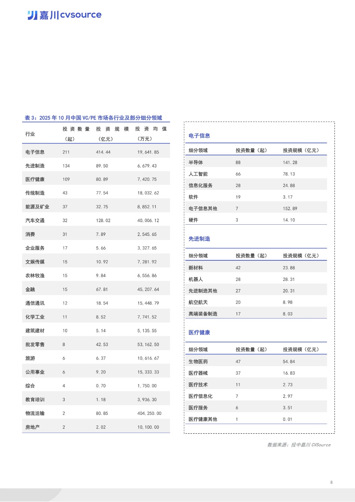 2025年10月, 募投市场受假期所限环比大幅度走低,同比增幅放缓但仍有10%以上增长,科技、先进制造领域更受机构关注。募资市场,机构活跃度同比增加,新设基金多投智能,完成募集基金多投半导体、制造等领域。投资市场整体呈波动升温,融资规模居高不下;企业中早期更受资本青睐,后期交易受门槛及市场形势所限有所下滑。