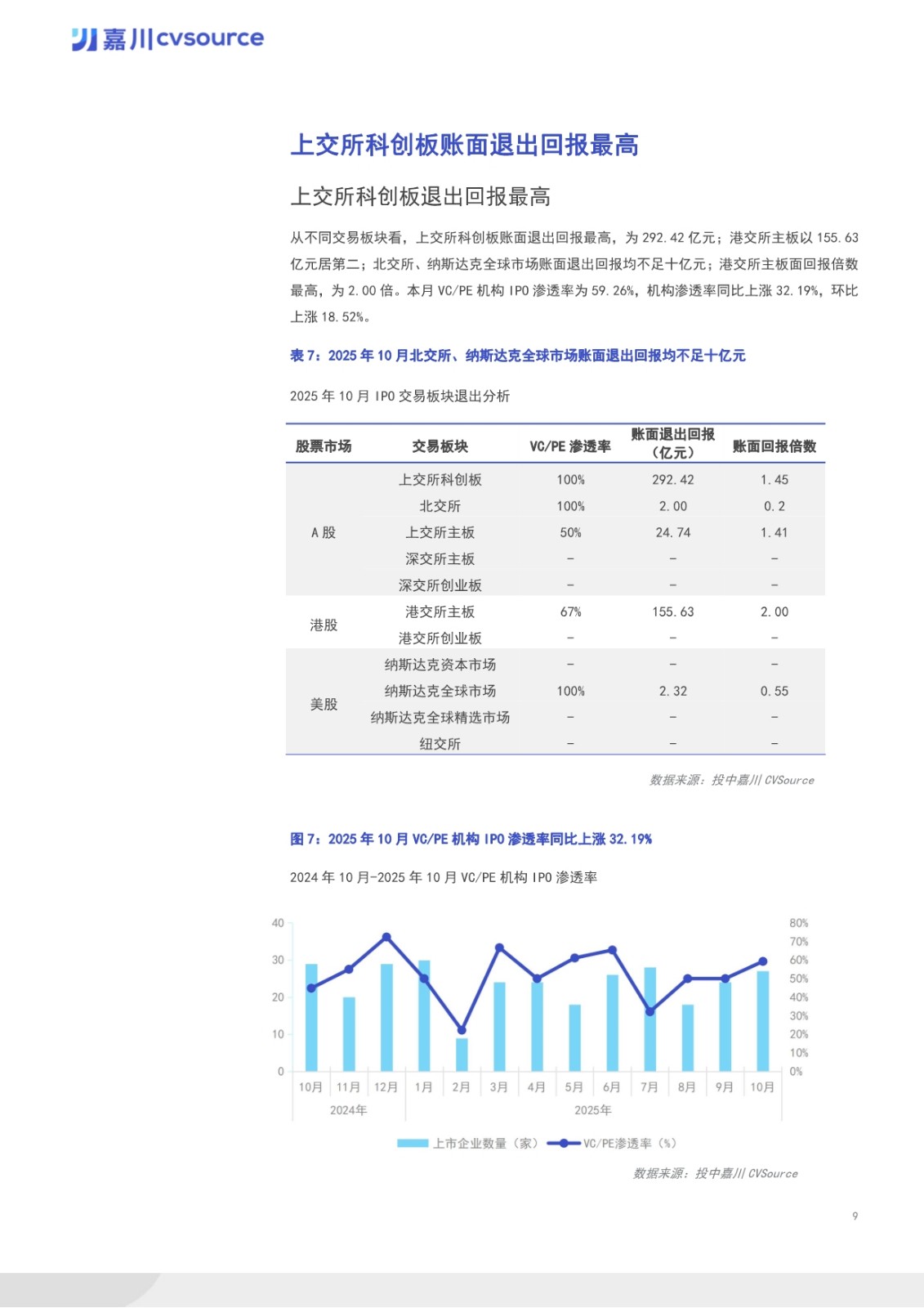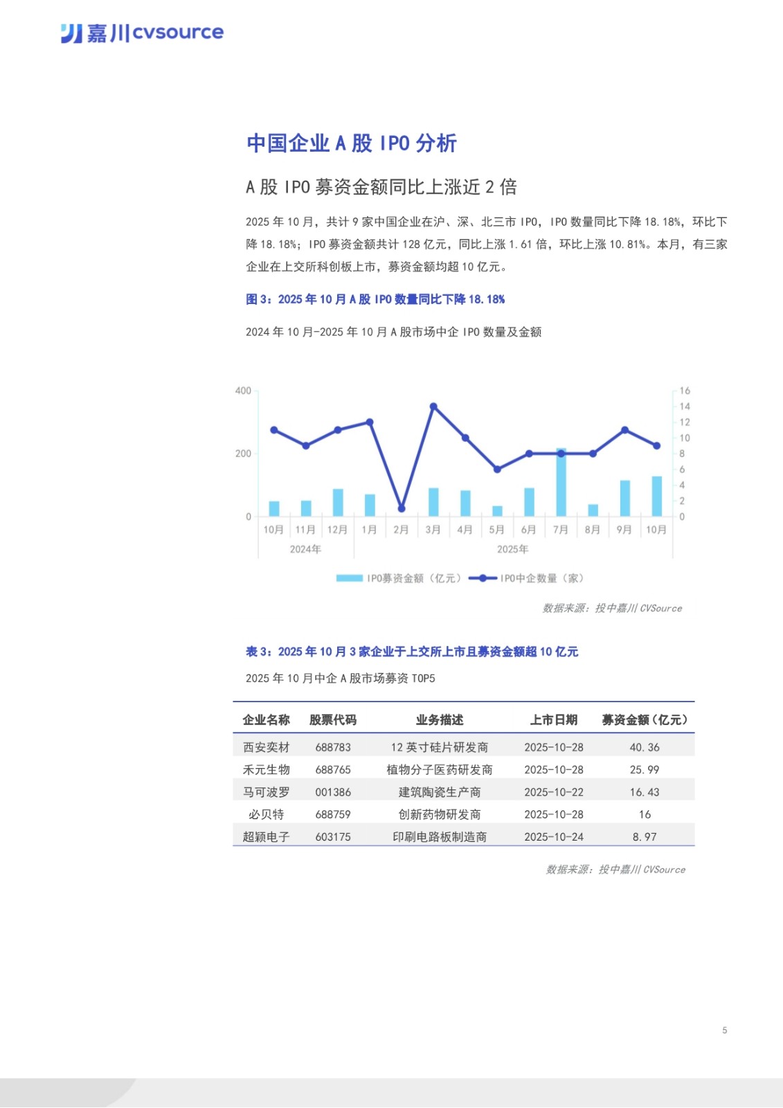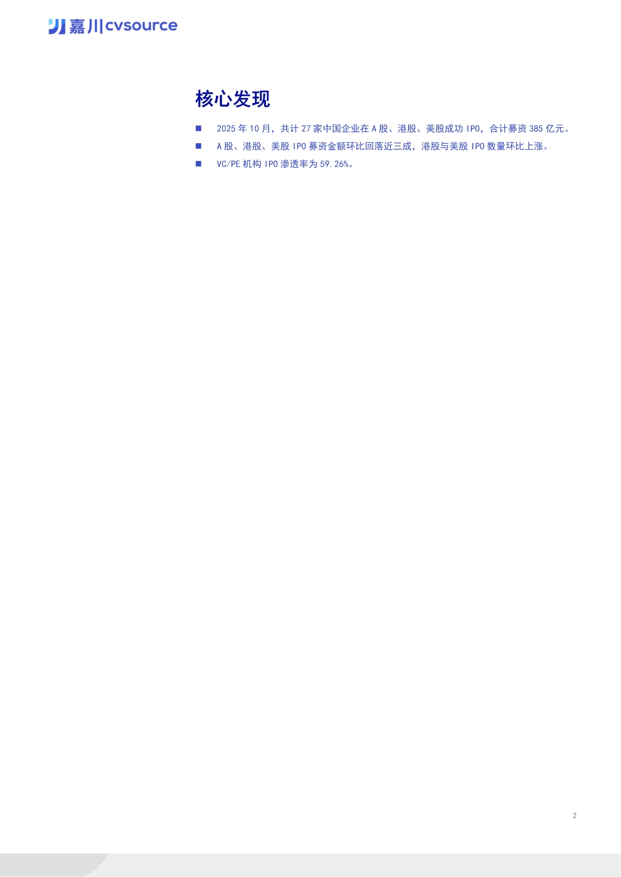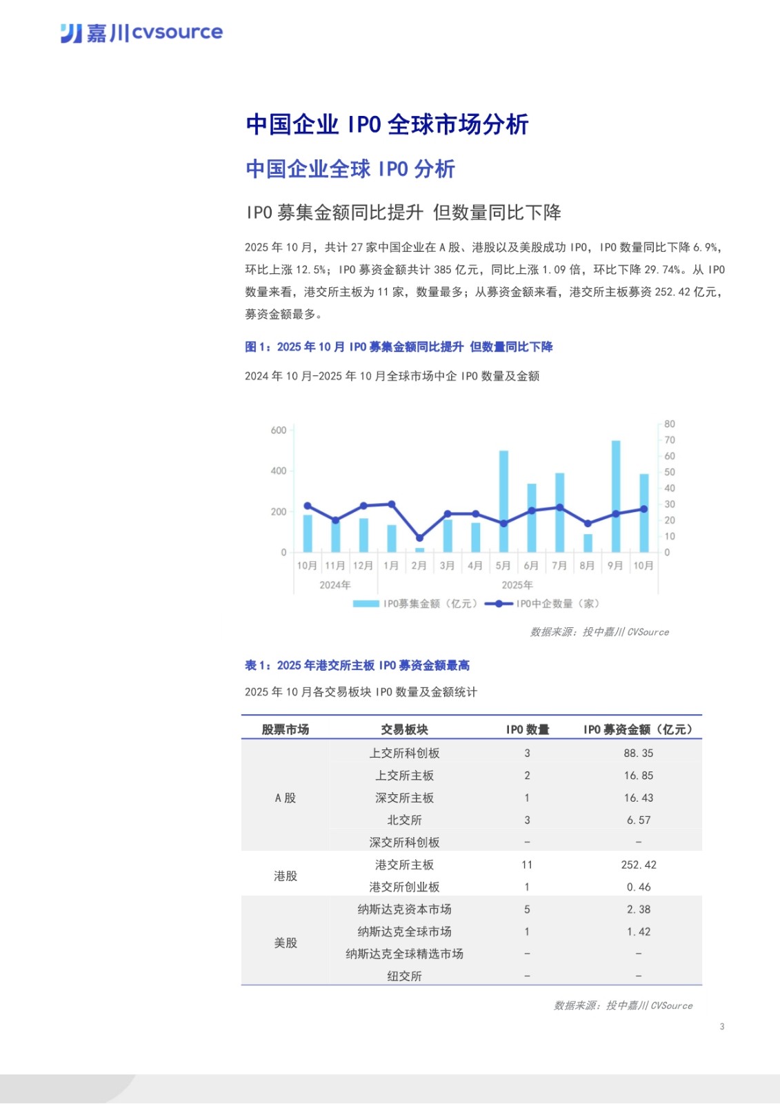 2025年10月,共计27家中国企业在A股、港股、美股成功IPO,合计募资385亿元。A股、港股、美股IPO募资金额环比回落近三成,港股与美股IPO数量环比上涨。VC/PE机构IPO渗透率为59.26%。